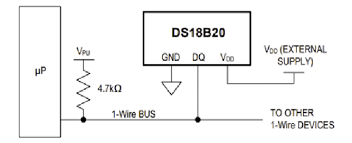 Le bus est placée au niveau logique 1 a l’aide d’une résistance de 4,7 K ohm située entre VCC et DQ. Cela veut dire qu’une ligne de bus 1-wire est toujours placée au niveau logique quand elle est libre.